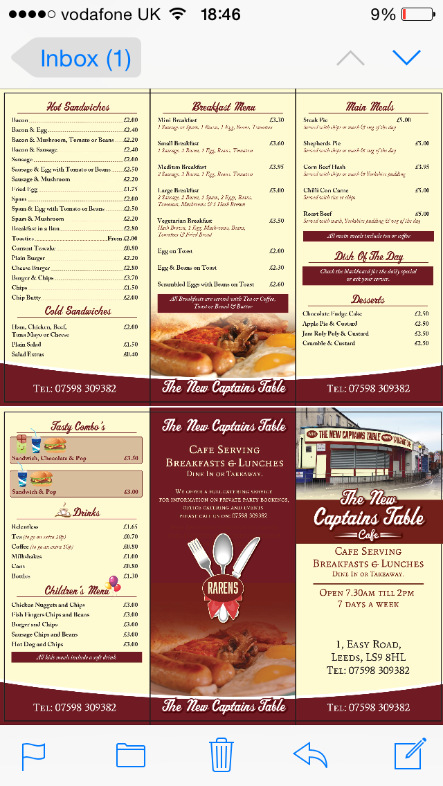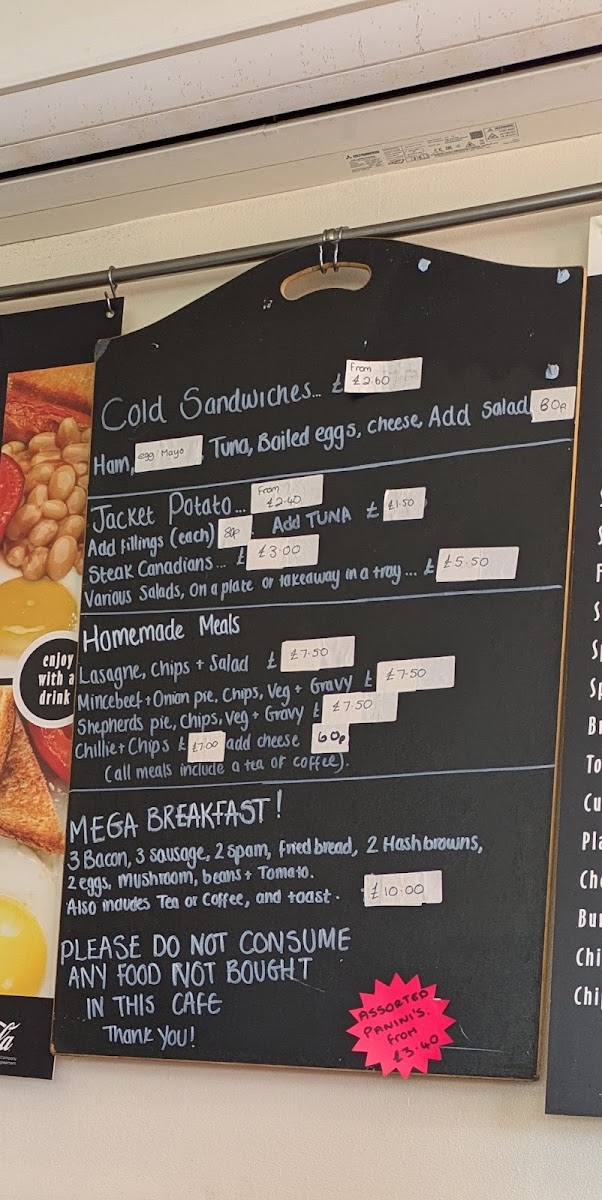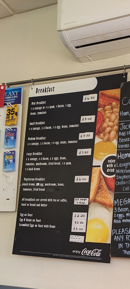 Breakfast selections include various portion sizes from mini to large breakfasts, as well as a vegetarian option. Egg-based dishes are also available, such as egg on toast, egg and beans on toast, and scrambled eggs on toast with beans. Coffee is offered alongside these breakfast items to complement the meal.